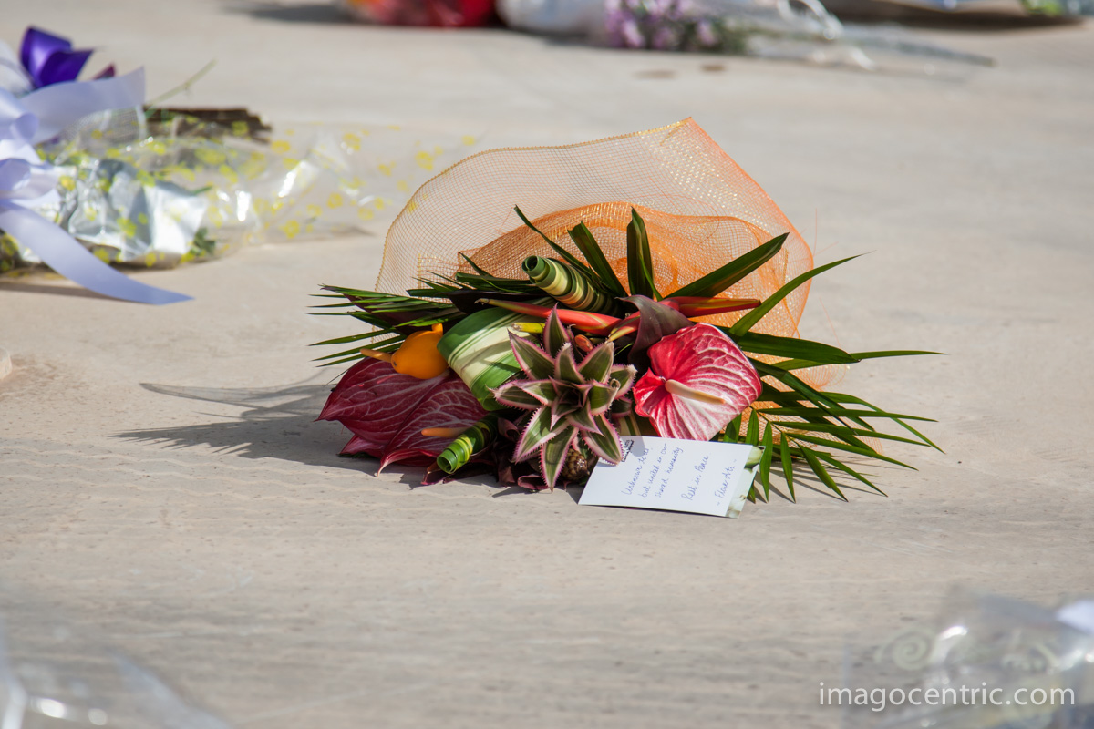 By 19:50 pm the march descended towards a beach in Sliema – another popular leisure spot for both locals and tourists where flowers were thrown into the sea and the candle vigil followed. The members of the crowd began to sing Amazing Grace and some of the migrants who survived the journey to Europe made short speeches thanking the public for their presence. Many cried as they recalled their own perilous journey towards safety. Hundred candles on the shore were in a striking contrast to the several families who organized a barbecue in the same location, apparently unaware of the planned event.