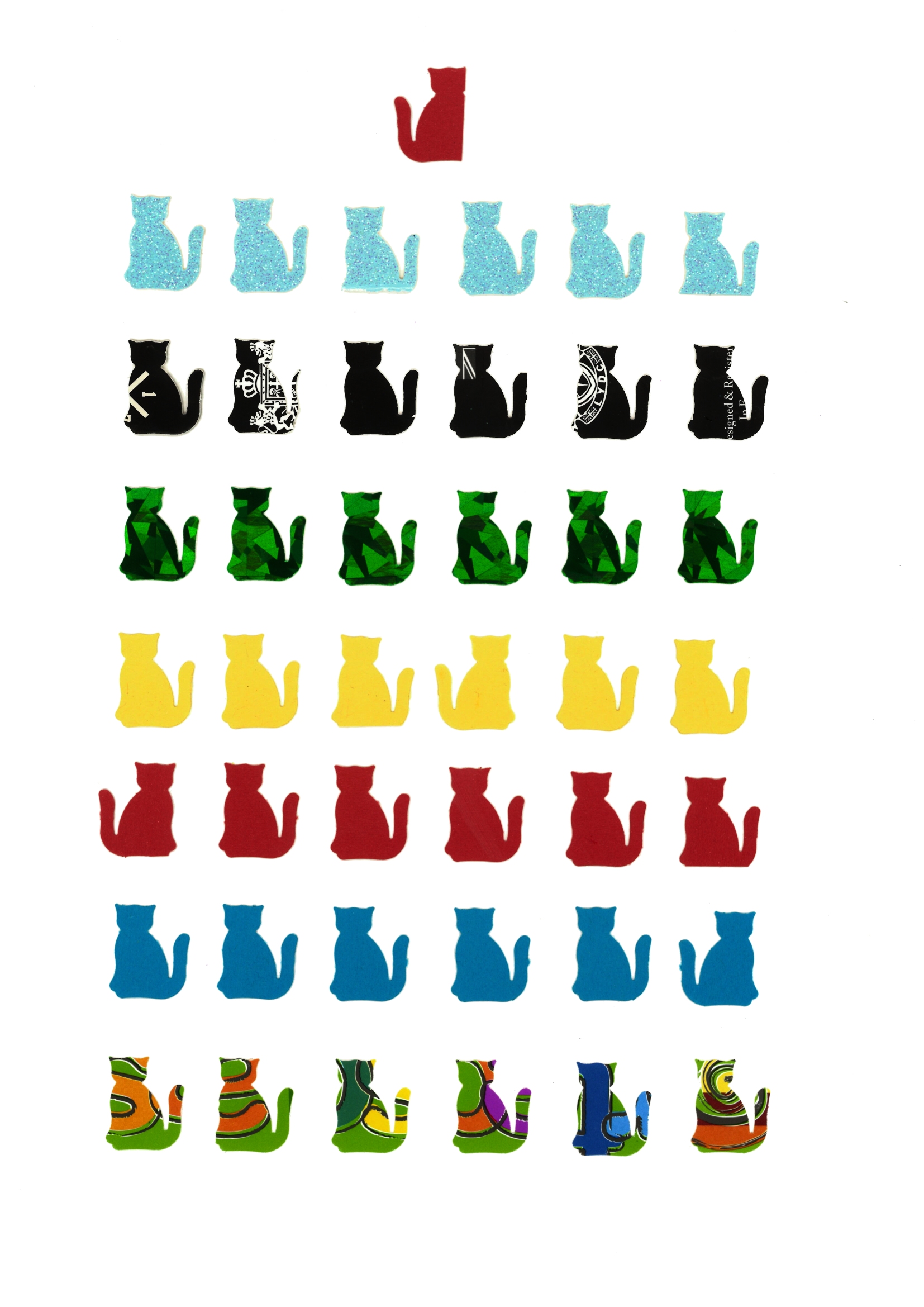 Please excuse the poor quality of the images, but they are actually pictures. It is hard to scan the artworks as they have many sticking elements that scanners generally do not like. Each artwork has been professionally framed and they will be available for sale. We also want to mention that all artworks have been designed by our mom, Olimpia Dabrowicz, the biggest cat lover in Poland and the owner of Cat-a-log collection.