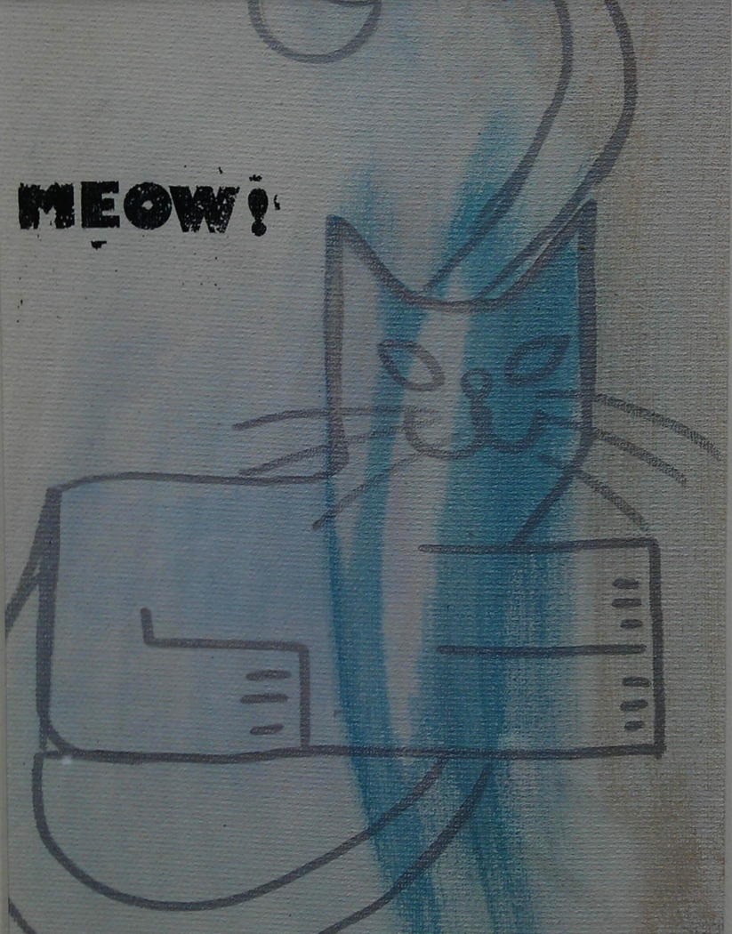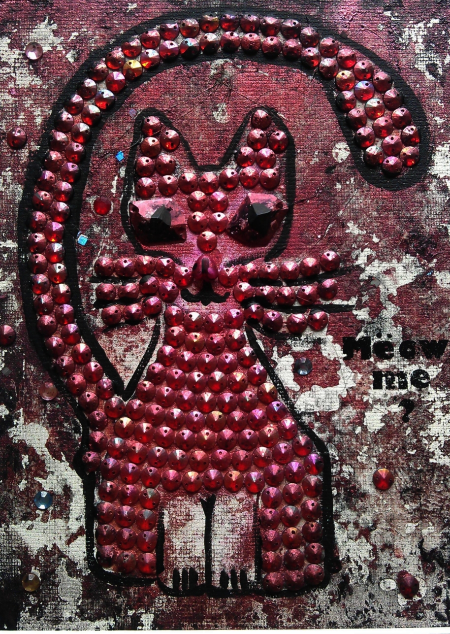 8. Meow me? – Meow me took about 6 hours to be made. We have used sequins from an old t-shirt and his eyes were made from plastic stones that have been coloured with acrylics to fit the rest. The background is done with a washing technique that removes the upper layers of paint before it dries up completely. We have used an old picture frame back to paint the cat on it. Looks good to us!