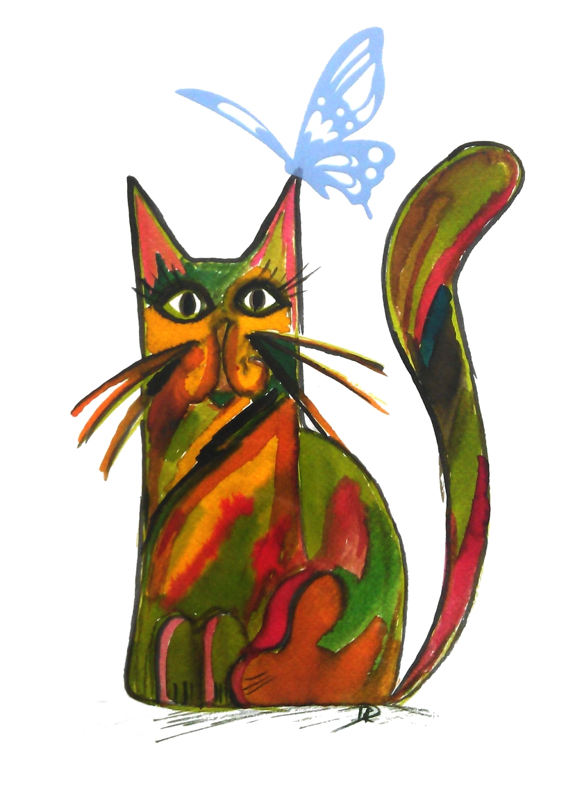 16. Butterfly – the last of wall stickers that were used in artworks number 13 and 14. This time it is not a flower but a butterfly. Rita is very proud of this one, the cat looks really surprised. Painted with ancient acrylic inks she found at her parent’s flat (they are over decade old).