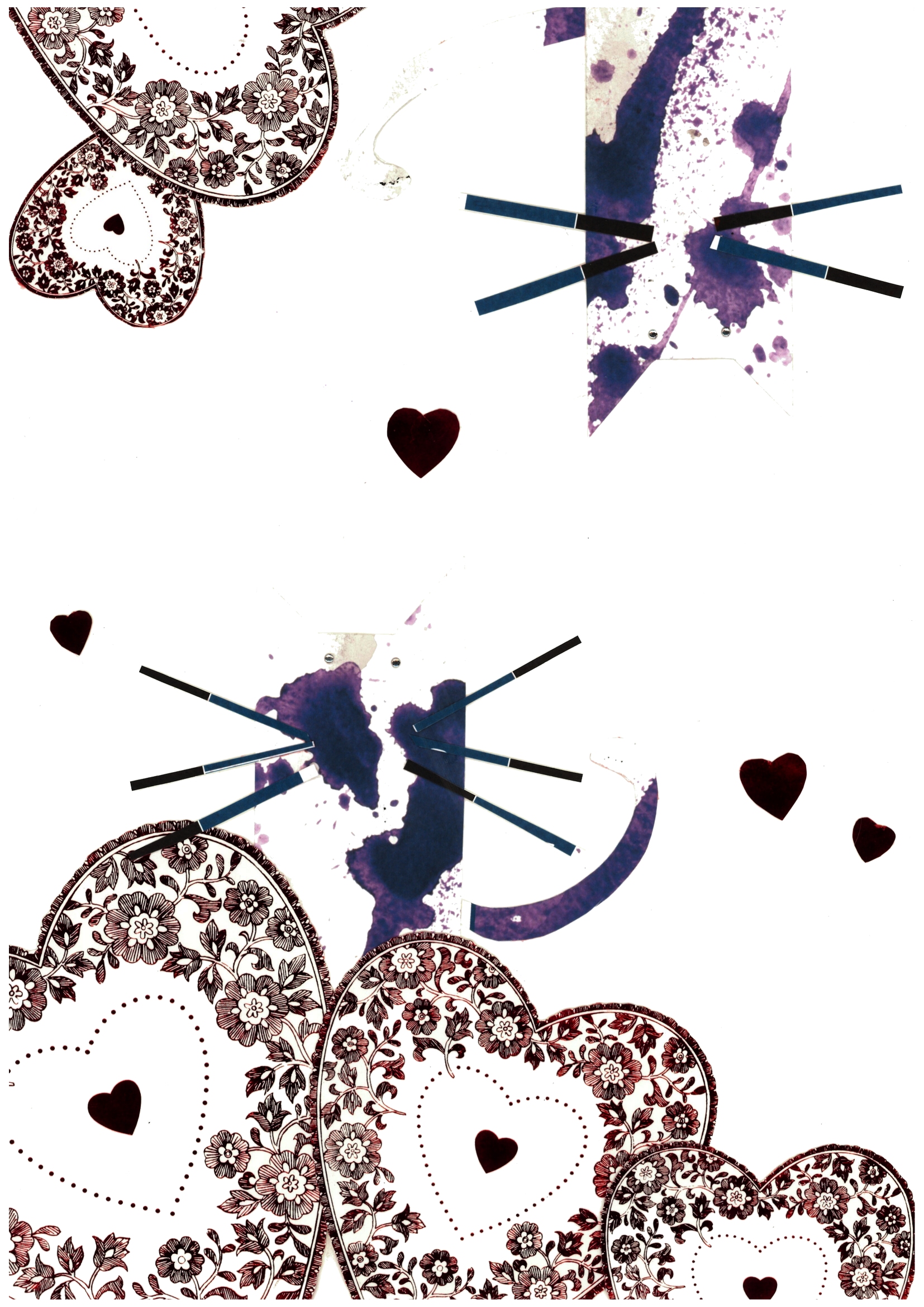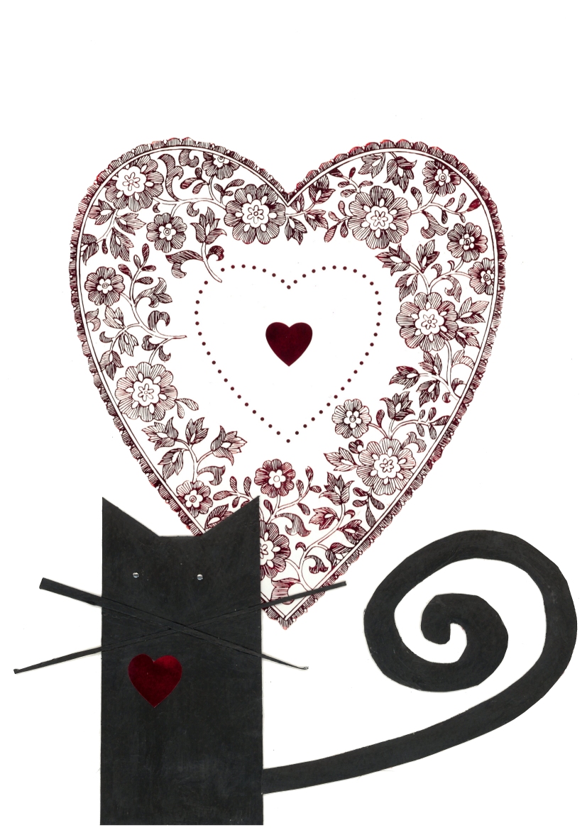 15. Cheesecake – again the same materials used to make artwork number 9. Big heart patters, cat made from old cardboard sheet painted black and long tail. Say hello to Cheesecake!