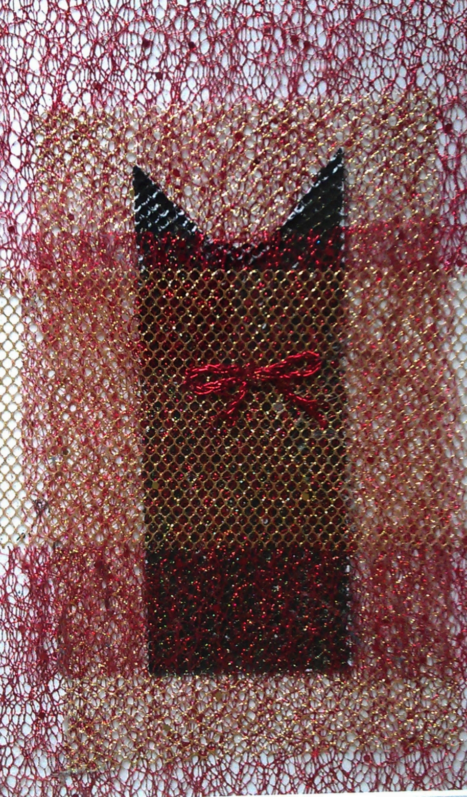 12. High fashion – this artwork has been made from the same materials as pictures number 5 and 1. A piece of cardboard painted black was placed among several layers of decorative mesh. Plus the bow is made from a red cord that was a part of beauty products packaging.