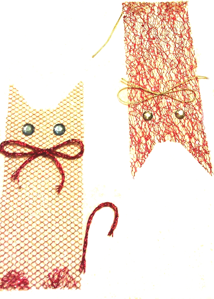 1. Up and down – two cats made from bits of fabrics, decorative cord and old buttons. You can easily find these materials in any art store or from your local tailoring shop. We purchased about 2 meters of the decorative mesh for a few pennies from a local tailor, who has a lot of various fabric bits left after the dresses are made. Normally, those bits are being thrown away as the tailors have little use for them, but they can be easily re-used. You have no idea how many interesting things can be found in a tailor’s bin!