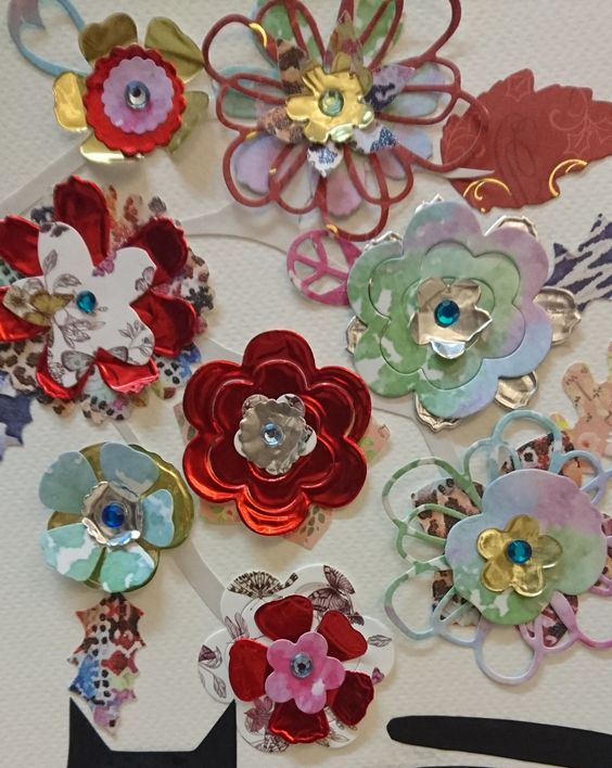 Cutting the flowers was a real nightmare for Rita and it took forever to do it. She has worked with brand new materials she has never used before and the experience was not a nice one. The artistic metal foil sheets are not only very thick and you need to apply a great amount of strength for them to go through the Sizzix machine, their edges are also sharp as knives and you have to be careful when you are using them. One composition took about 6 hours from the beginning to finish