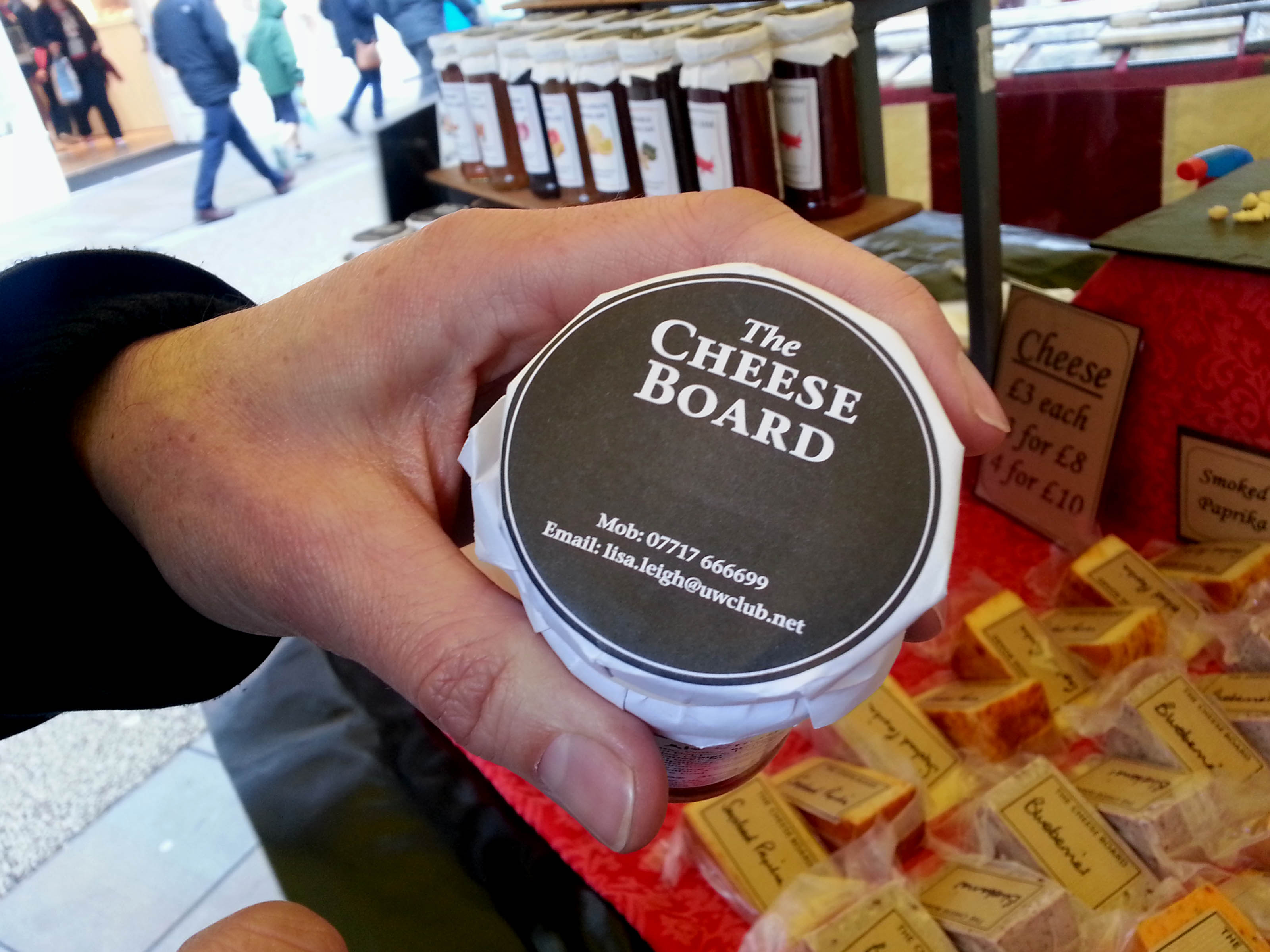 We have saved the best for the last. Our neighbors, Manchester based company called The Cheese Board do not have Facebook page or their own website but their food is to die for. To learn about them you have to attend local markets, but once you taste their food, you will be coming back for more. As the name suggests, the Cheese Board makes a great range of special cheeses for your enjoyment – from Guinness flavoured cheddar (we got one for ourselves), Red Wine Port, Garlic Lancashire, Cheddar Madras, Wensleydale Blueberry, Cheddar and Leek, Balsamic Onion, Fiery Dragon, Smoked Paprika to Red Leicester with black pepper. You can also purchase a huge selection of chutneys (cider and apple, hot rhubarb, sun dried tomatoes and garlic, mango, lime and ginger to name a few), marmalades (brandy, whiskey and red onion) and jams (chili, rhubarb and ginger). To make your order, please contact Barry or Lisa at Lisa.leigh@uwclub.net or by calling 07717666699.