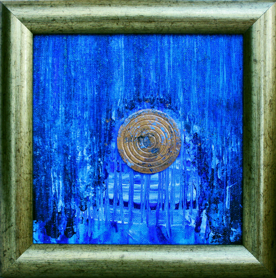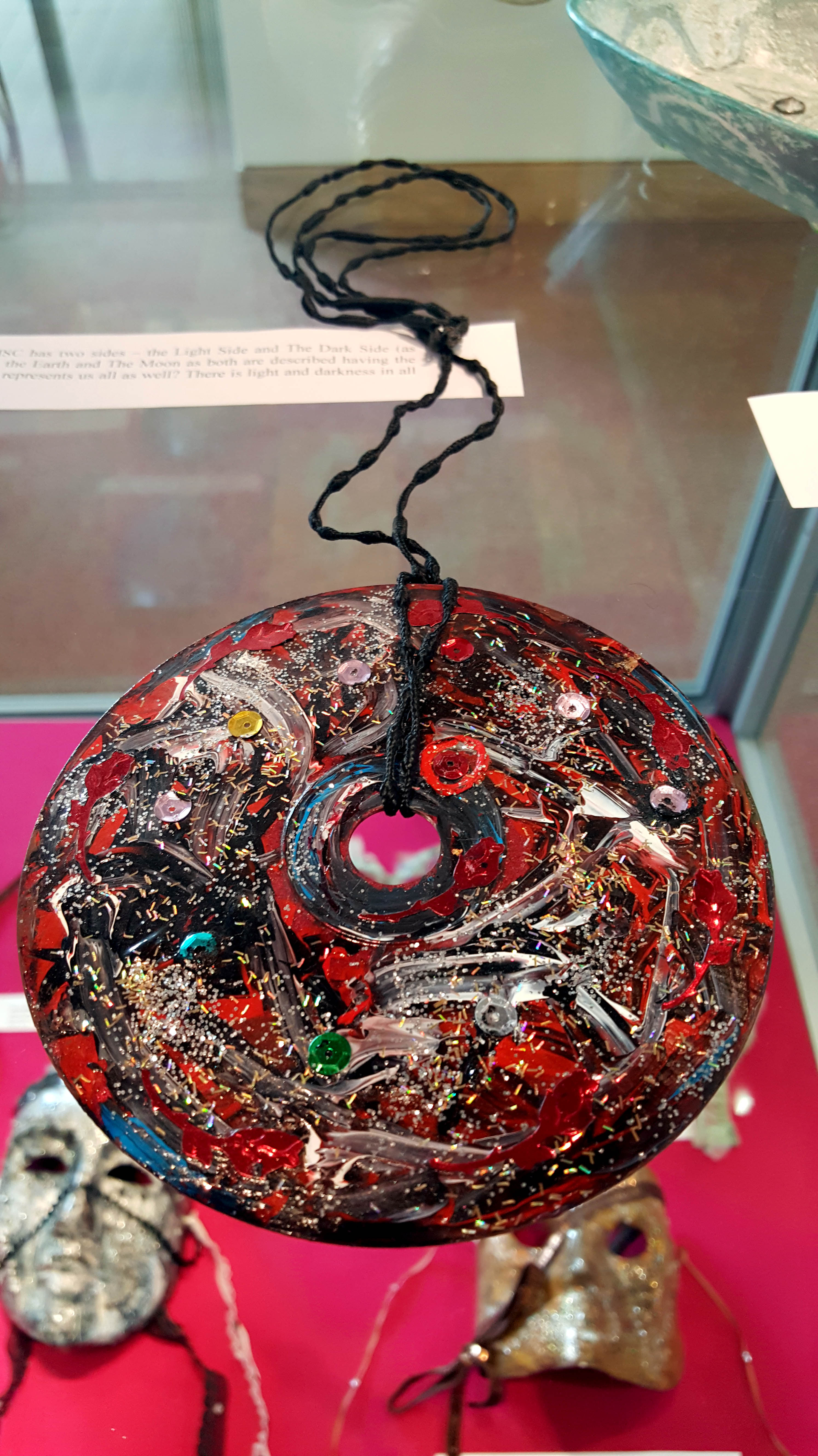 Mixed media on plastic. The DISC has two sides – the Light Side and The Dark Side (as visible here). It symbolizes both; the Earth and The Moon as both are described having the light and the dark sides. Maybe it represents us all as well? There is light and darkness in all of us.