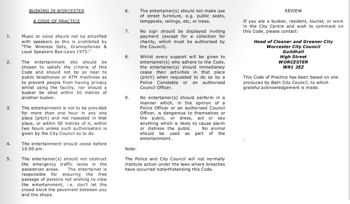 Many people – like us – were upset because we were trying to find out the text of buskers code in Worcester and nothing was available. Not on the City Council web site or anywhere else. If one had persistence – after hours of pestering  Uncle Google, you could find these and they are not a joy to read.