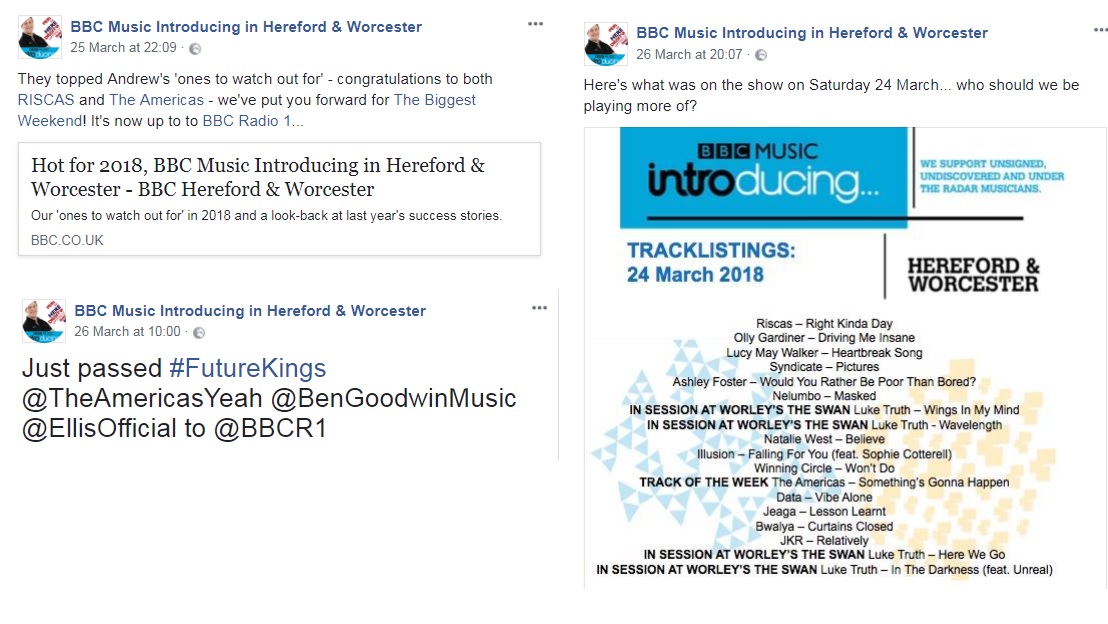 Tight schedule paid off. There was a bit of March Madness at local BBC Introducing Hereford and Worcester last week. On March 24th The Americas were recommended for BBC 1, then on March 25th they have been put forward to BBC Big Weekend Festival in Swansea alongside with RISCAS and on March 26th “Something`s Gonna Happen” was in rotation and was again a song of the week on the station.