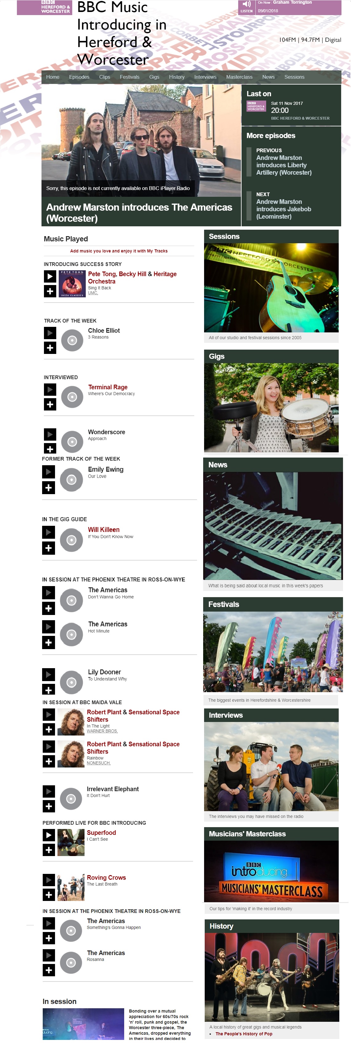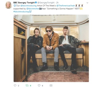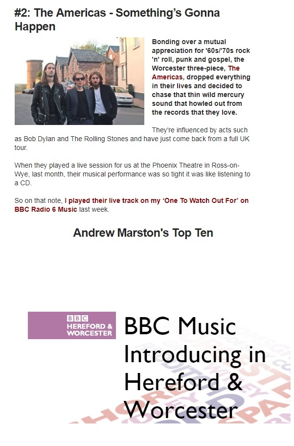 On 6th January 2018 BBC Introducing Hereford & Worcester unveiled their own top ten of best bands for 2017 and guess who was ranked at #2? Yep, The Americas. At this stage, we were not surprised to hear Andrew Marston praise the band for their melodic songs and incredible energy. The show featured “Something`s Gonna Happen” being aired, followed by a short interview with the artists.