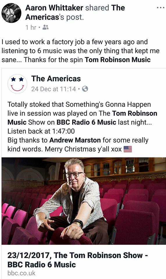 And then all hell broke loose. On December 23rd 2017 The Americas have been featured on national radio – BBC 6 Music as part of Tom Robinson Show. If you don’t know Tom from his musical career that spans four decades (“2-4-6-8 Motorway“), you may know him from his career as DJ and his own portal that champions new music (Fresh on the Net). Tom is one of the biggest taste makers in United Kingdom and one of the most cherished DJs on BBC 6 Music. Having a spin on his show – is not a small feat. Being featured on Christmas show is like winning a lottery. No wonder that The Americas response was very emotional.