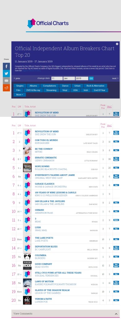 official independent album breakers chart top 20 official charts company Columbia spent three weeks on the charts with the peak position at number 1