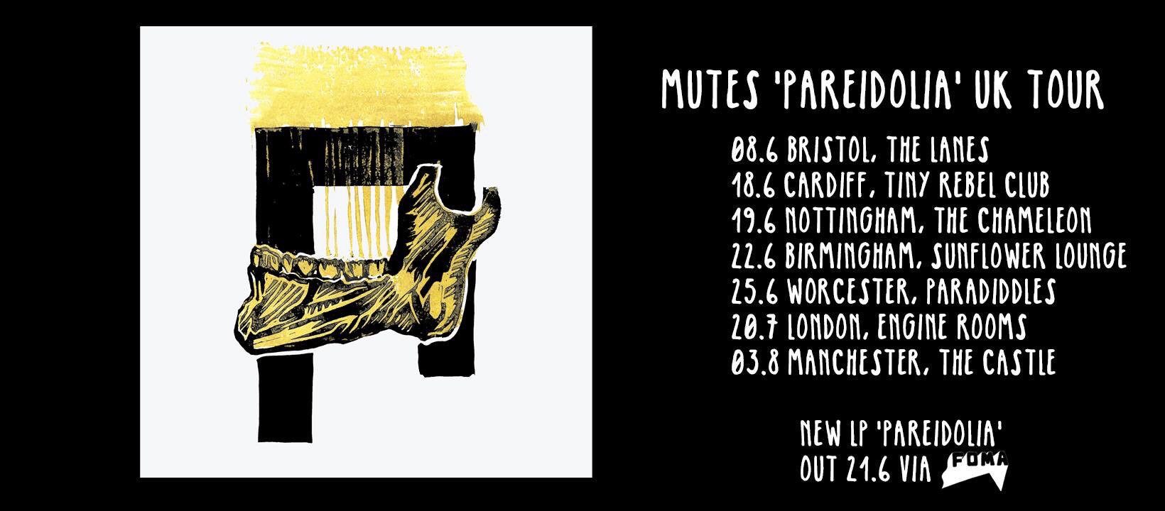 Official bio: After two long, domesticated years of breakups, job losses, uprooting and rebuilding, Mutes have returned with their reactionary, tempestuous sophomore LP “Pareidolia”– a meandering, exhilarating record that sees the Birmingham post-punk group delivering something entirely new. Mutes have continued to build up a national reputation supporting bands such as Sorry, No Age, Cloud Nothings, The Cribs, PINS, Menace Beach & more. The group have received a steady stream of acclaim for their recorded output and live shows since 2014.