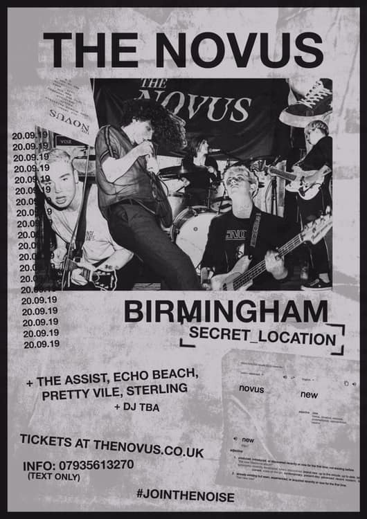Early this year we introduced you to The Novus – a Birmingham band that is gathering a lot of interest around the country for their music and commitment to art. The Novus take no prisoners, do not hold back and precisely direct their anger. They play instruments like lives depend on it and wear slogans on their tees with pride. This shoot straight and speak the truth attitude is winning them fans so quickly that even BBC 1 is paying a close attention. Today we return to speak to the band about their biggest show to date – at a 500+ capacity mystery venue in Birmingham. Yes, you heard it correctly – a band found a brand new place to play in the capital of West Midlands and are throwing a party of the year. Everybody`s invited. Not only a new space is being introduced, there will be a killer line up, an exhibition, a special DJ set, one band will play their final set, another one will have their debut one. Its all DIY. We sat down with Tyla Challenger – the bass player for the band to learn more about the concert, preparations and how you can secure yourself a pass for this event.