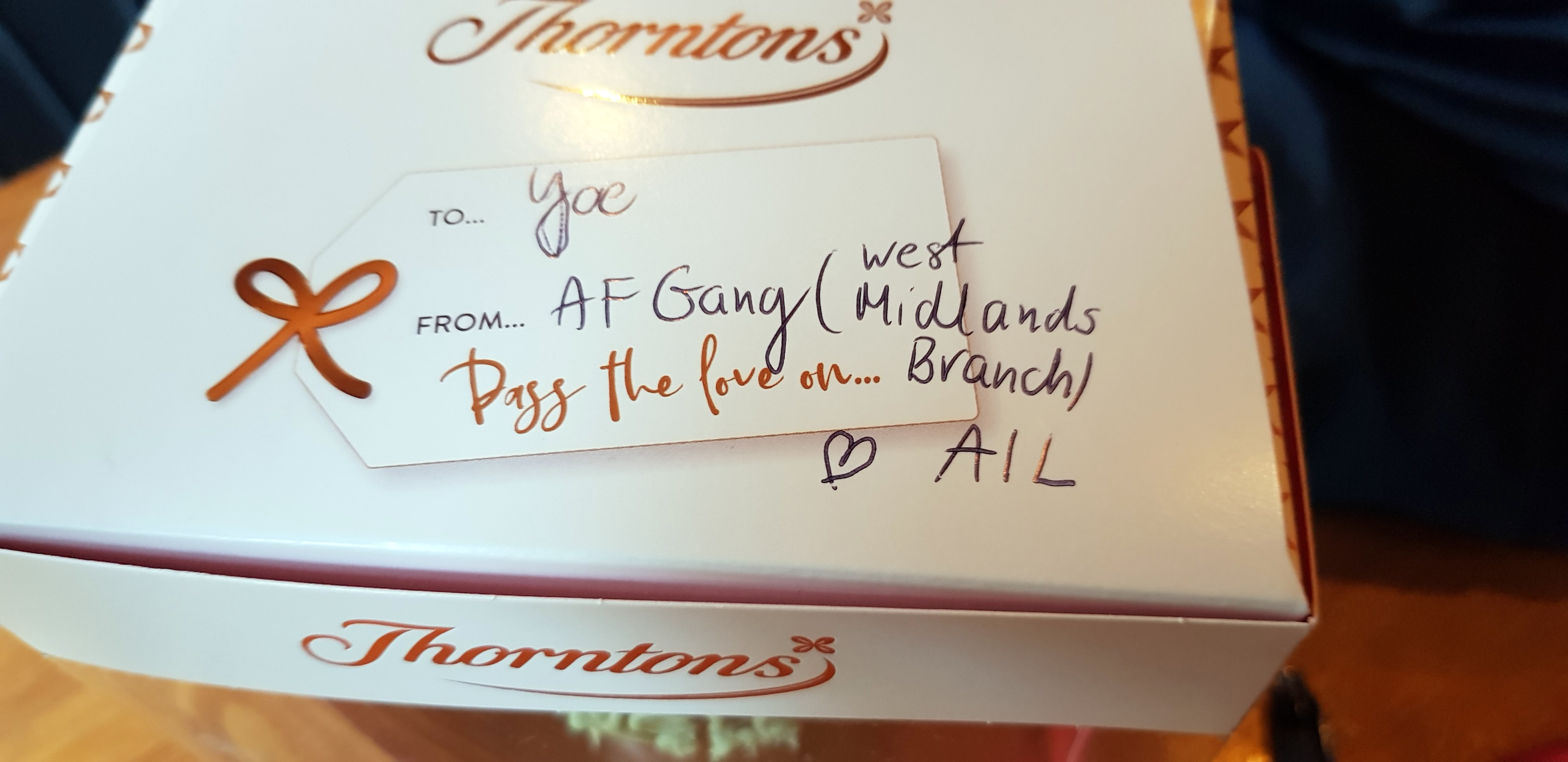 We gave Joe a small gift on behalf of all AF West Midlands fans who couldn’t make it to the show. He actually loved it and laughed hard when he saw the writing on the Thornton’s chocolate cup.